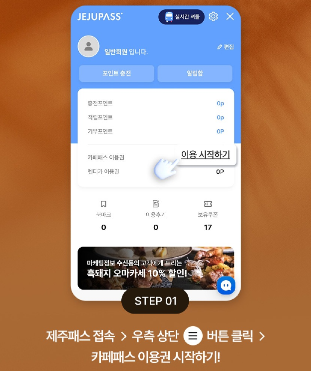 ▶ 제주패스 접속: 우측 상단의 버튼을 눌러 카페패스 이용을 시작하세요.
